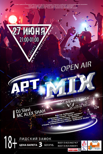 27 июня фестиваль молодежных субкультур «Молодежная волна» предлагает раскачаться в ритмах open-air «Арт-MIX» в Лидском замке. В 21:00 старт зададут участники эстрадной студии «Лида-мюзикл», эстрадной студии «Акцент», эстрадного коллектива «Талисман», студии современного танца «АrtDance Studio», Виктор Лебедевич. Любителей зажигательного отдыха ожидает завораживающее огненное шоу Лидской фаер бригады «Огненные Вороны». Прочувствовать энергию музыкальной волны вам помогут мастера своего дела DJ Slavi и MC ALEX SHAH. Если ты готов обновить свой арсенал позитива – приходи сам, пригласи девушку и друзей, чтобы отметить наступление уик-энда в приятной компании под ритмы энергичной танцевальной музыки! Лидский замок Цена билета: 3,00 бел.руб. Дополнительная информация по телефонам: 546747, 548691 | |