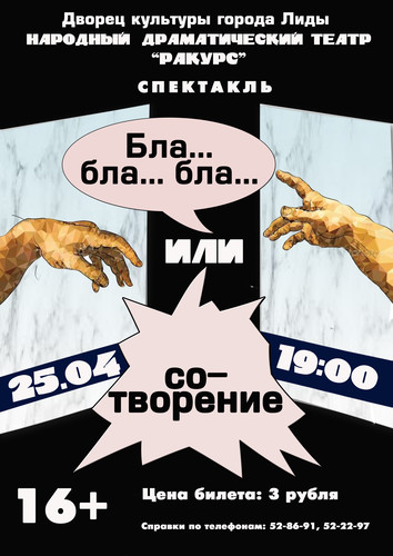 25 апреля 2019 года в 19:00 в малом зале состоится премьерный показ спектакля «Бла-бла-бла...» или «Со-творение» народного драматического театра «Ракурс» государственного учреждения «Дворец культуры города Лиды». Колоритные образы персонажей и их жизненные коллизии, хитросплетение сюжетной линии, интригующие место действия и обстоятельства пьесы не оставят зрителя равнодушным. Возрастное ограничение: 16+ Цена билета: 3 рубля. Справки по телефонам: 52-86-91, 52-22-97.
