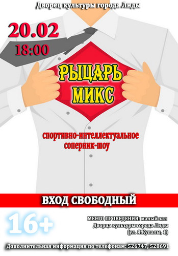 В преддверии Дня защитников Отечества Дворец культуры города Лиды приглашает весело провести время с друзьями и сверстниками на спортивно-интеллектуальном соперник-шоу «Рыцарь микс», которое состоится 20 февраля в 18:00. Самые отважные юноши смогут продемонстрировать свои умения, знания, находчивость и быстроту, приняв участие в задорных конкурсах. Приходи! Будет весело! Вход свободный. Дополнительная информация по телефонам: 8(0154)526747, 528691 | |